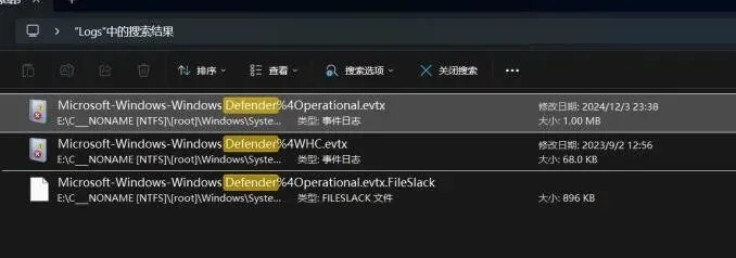 然后根据防御的英文Defender ,找含有Defender的.evtx文件 ,或者直接在该目录下搜索Defender ,出现下面3个文件