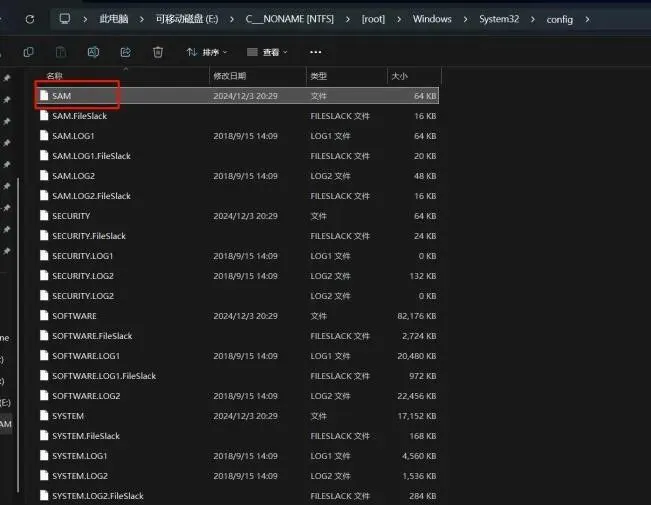 路径:E:\C NONAME [NTFS] \ [root] \Windows\System32\config\SYSTEM SAM 文件
