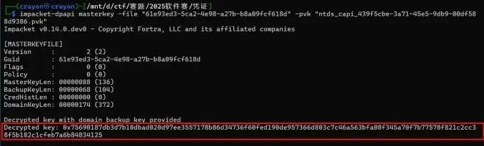 impacket-dpapi masterkey -file " 61e93ed3-5ca2-4e98-a27b-b8a09fcf618d " -pvk " ntds_capi_439f5cbe-3a71-45e5-9db9-00df588d9386 .pvk "