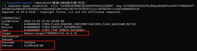 4.用解密后的主密钥解密凭据文件(impacket-dpapi credential),得到明文连接凭据。