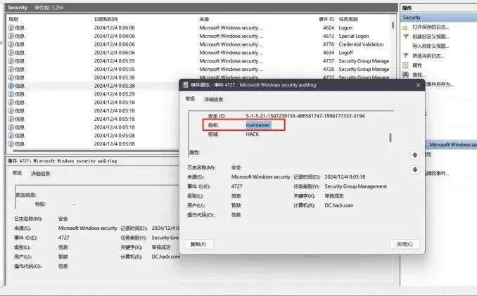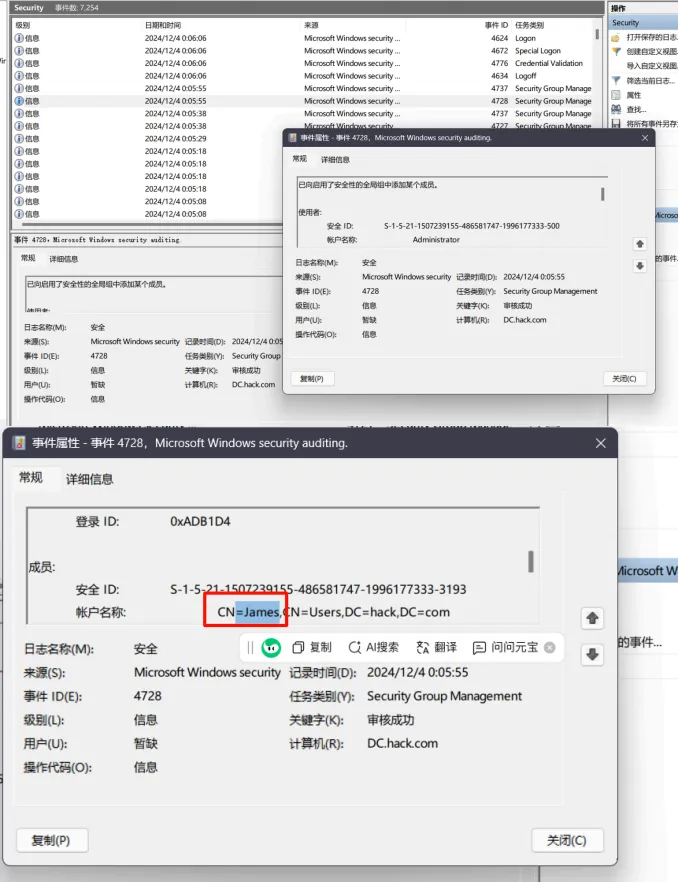 从安全日志中追踪用户和组的创建、成员添加操作 ,并获取账户密码