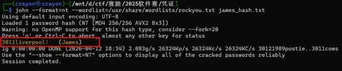 john --format二nt --wordlist二/usr/share/wordlists/rockyou .txt james_hash .txt