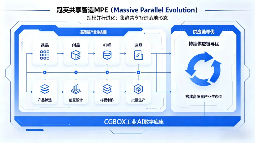 冠英科技集团恰逢其时,高举共享智造MPE旗帜,吹响中国产业集群反内卷、争创新号角。冠英共享智造MPE(Massive Parallel Evolution),规模并行进化,是冠英落地集群共享智造的具体形态。以AI为核心,以算力算例为双驱动引擎,组织产业集群选品、创品、打样、造品,并通过持续的供应链寻优,构建高质量产业生态圈,打造能快速满足场景化需求,抢占未来产业赛道与新品市场的商业生态体系。