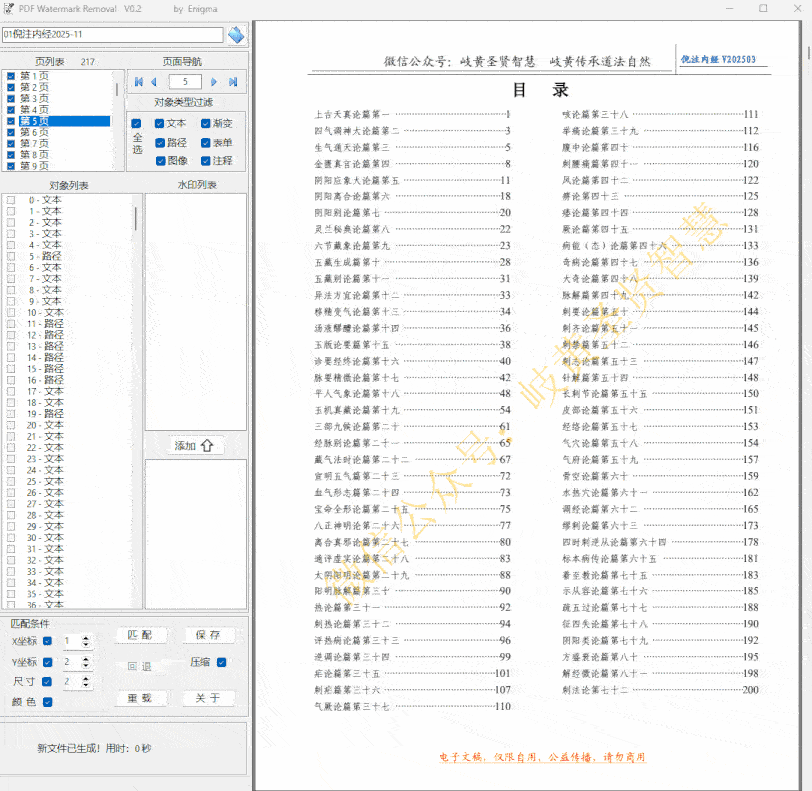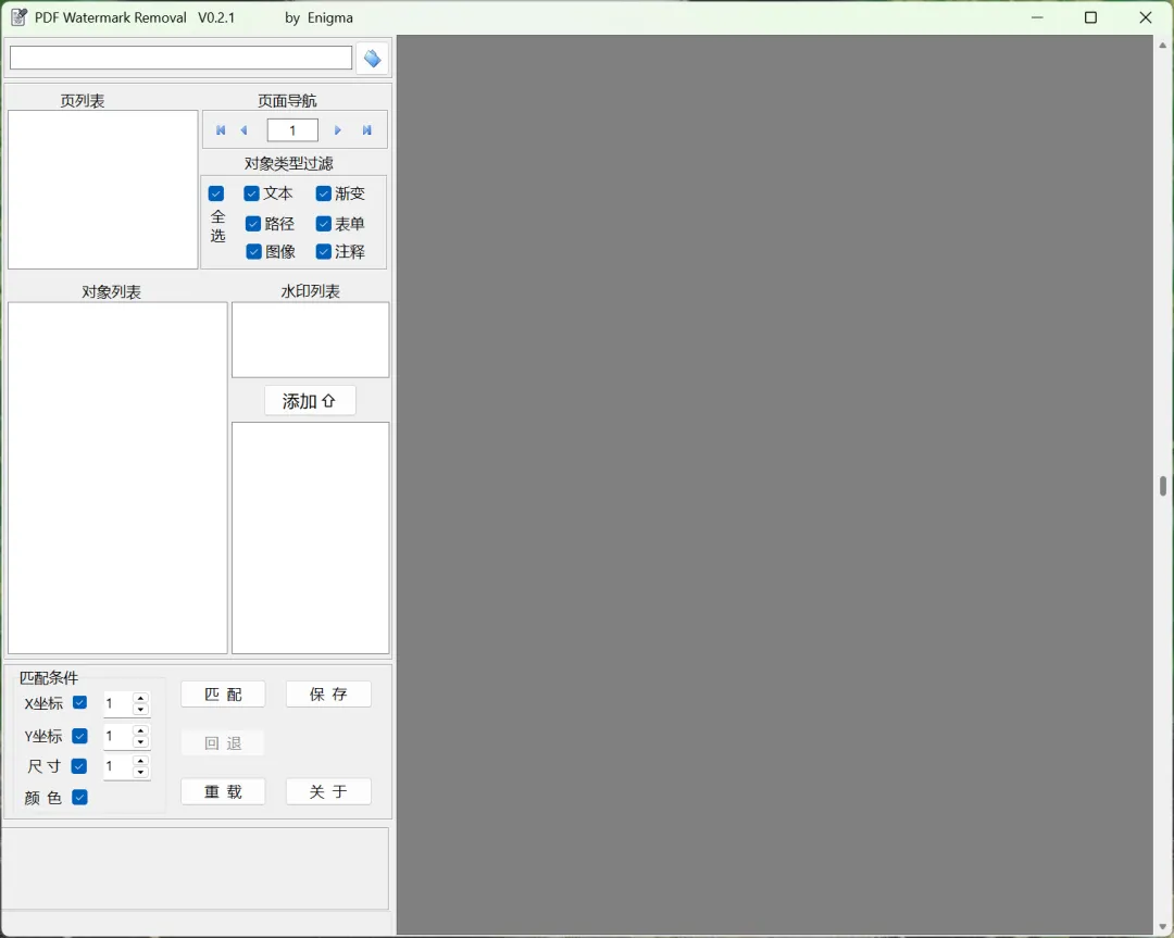 去除普通的水印操作非常简单,加载PDF(不能直接拖拽),然后勾选水印的文本或者表单,点匹配即可消除水印,最后点击保存即可。