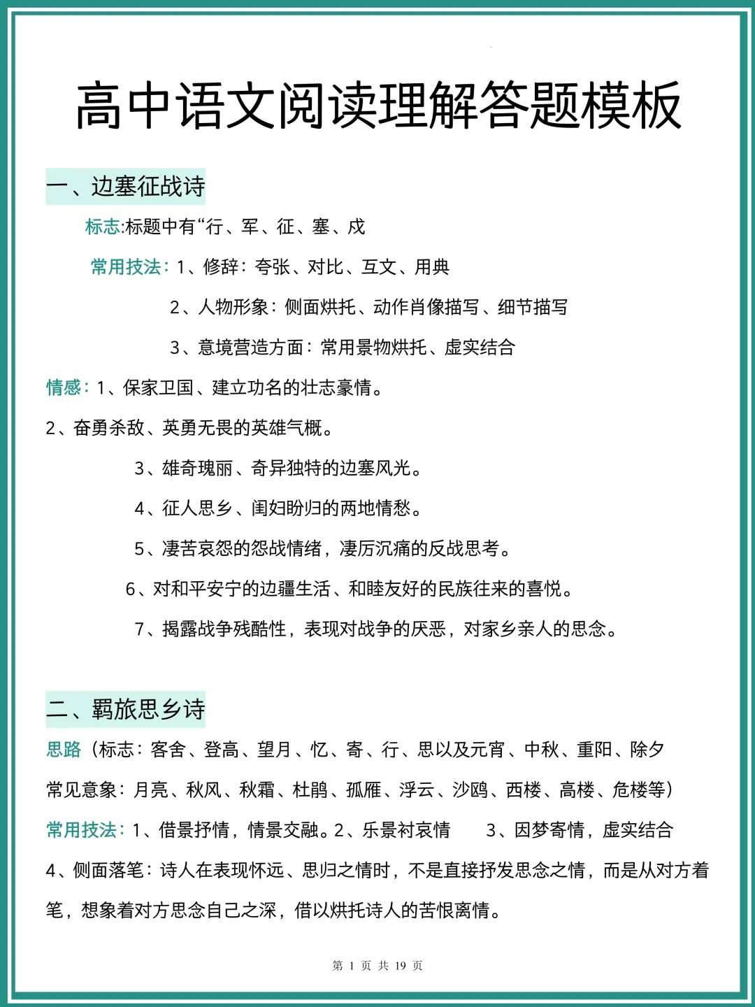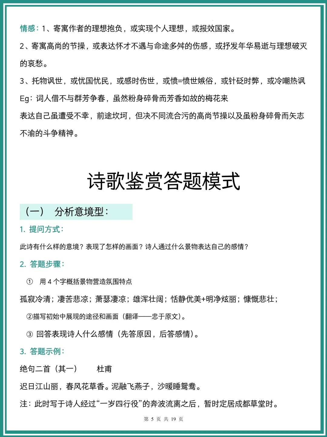 这份诗歌鉴赏资料,把各类题材的答题逻辑与步骤完整归纳,用简洁易懂的方式梳理答题框架与规范话术,不用死记硬背,快速掌握答题思路,考场按步骤作答,轻松踩中所有采分点,稳稳拿下诗歌鉴赏板块分数。