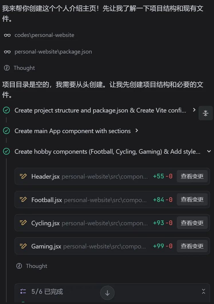 经过几轮愉快的对话,豆包会输出一份格式非常专业的“设计文档”。里面可能详细列出了:导航栏包含哪些板块、背景采用深色星空主题、中间放一个自我介绍卡片等。 这时候你要像真正的产品经理一样评审这份文档:这符合我的想法吗?有没有需要修改的地方?确认无误后,直接把这份文档复制下来。 这就完成了从“脑暴创意”到“标准化工程文件”的完美转换。第三步:实战开发 —— 让 TRAE 开始“搬砖”