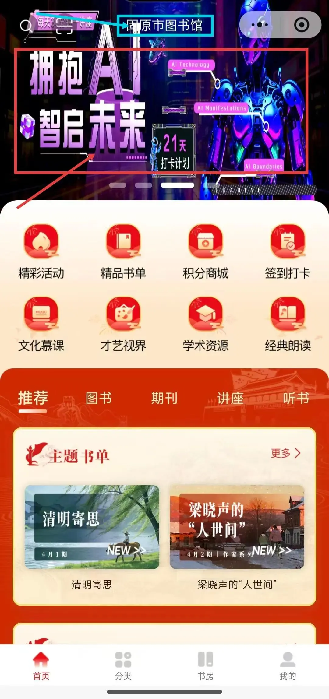 关注“固原市图书馆”微信公众号,菜单栏选择“数字服务”进入“超星读书”小程序,首页轮播图点击进入即可报名参加
