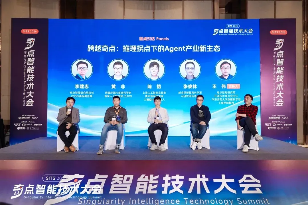 主会圆桌环节,在奇点智能研究院开源技术委员会主任、华东师范大学数据科学与工程学院教授王伟的主持下,奇点智能研究院院长、CSDN高级副总裁李建忠,荣耀终端 AI 首席科学家、首席人工智能官(CAIO)黄非,上海人工智能实验室青年领军科学家、大模型中心负责人陈恺,新浪微博首席科学家及 AI 研发部负责人张俊林共同参与讨论。
