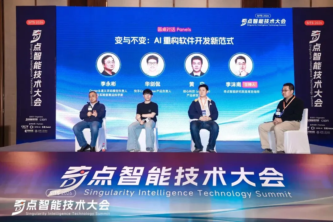 在由奇点智能研究院首席咨询师李沫南主持的圆桌对话中,Qoder&通义灵码模型负责人、通义实验室算法科学家李永彬,快手 CodeFlicker 产品负责人华剑侃,硅心科技(aiXcoder)产品研发负责人黄宁,共同围绕“变与不变:AI 重构软件开发新范式”这一主题展开讨论。