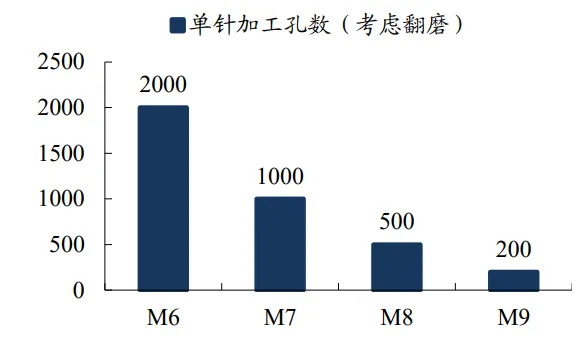 结果就是:钻针在M6材料上能打2000个孔,在M7/M8上打500-1000个孔,到了M9材料上,只能打200个孔、损耗速度提升4-5倍。