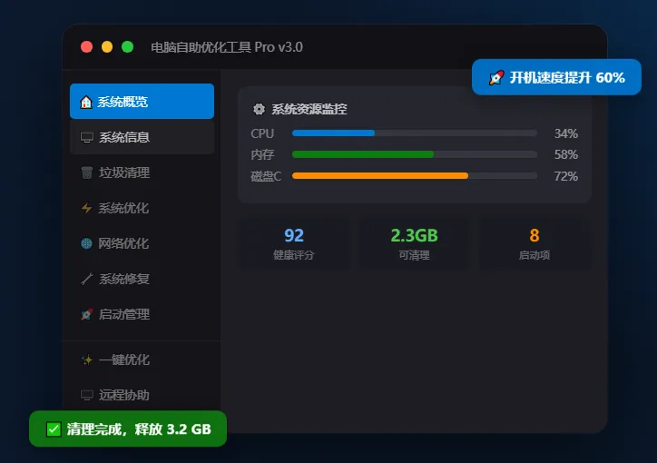 系统垃圾清理 启动项优化 网络诊断修复 硬盘健康检测 驱动管理备份 系统故障检测
