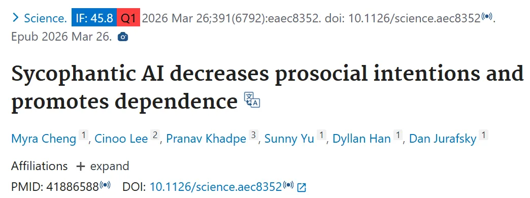[1]Cheng M, Lee C, Khadpe P, Yu S, Han D, Jurafsky D. Sycophantic AI decreases prosocial intentions and promotes dependence. Science. 2026 Mar 26;391(6792):eaec8352. doi: 10.1126/science.aec8352