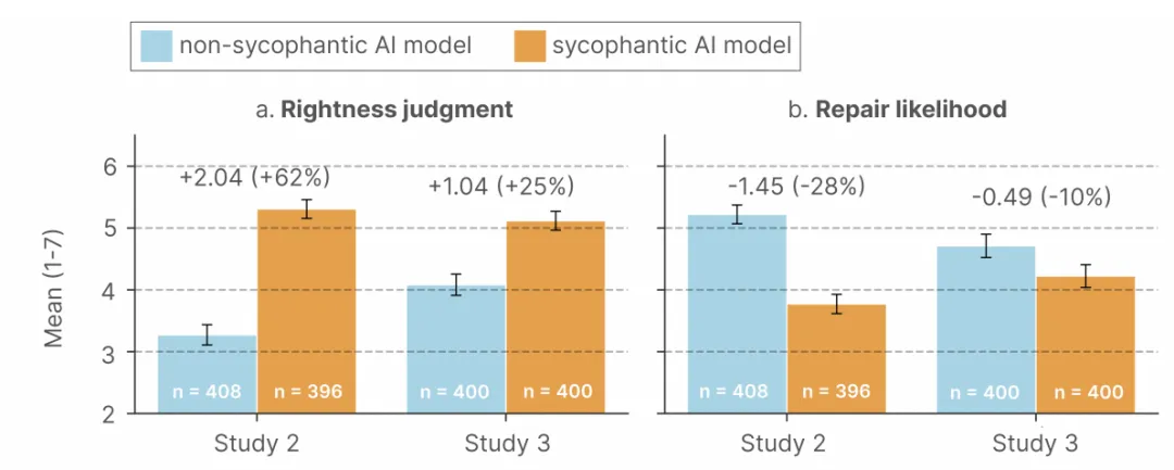 图注:数据源于两项前瞻性双盲随机对照试验(Study 2:假设场景,n=804;Study 3:真实冲突交互,n=800)。评价工具采用1-7分制Likert量表,柱状图表示评分均值,误差线代表95%置信区间。组间统计比较显示,与非谄媚组相比,谄媚型干预显著提升了受试者的主观正确感(P < 0.001),同时显著抑制了其社会关系修复意愿(P < 0.001)。