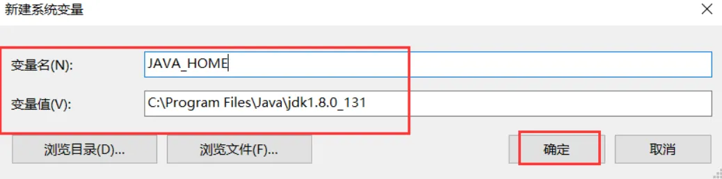 12.变量名输入JAVA_HOME变量值输入安装步骤第6步复制后的安装路径。C:\Program Files\Java\jdk1.8.0_131\点击确定