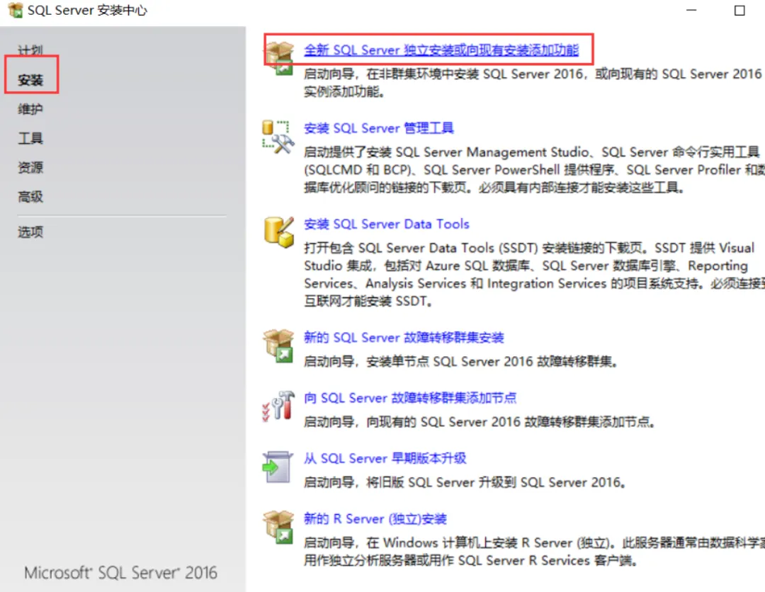3.点击安装,点击“全新SQL Server独立安装或向现有安装添加功能