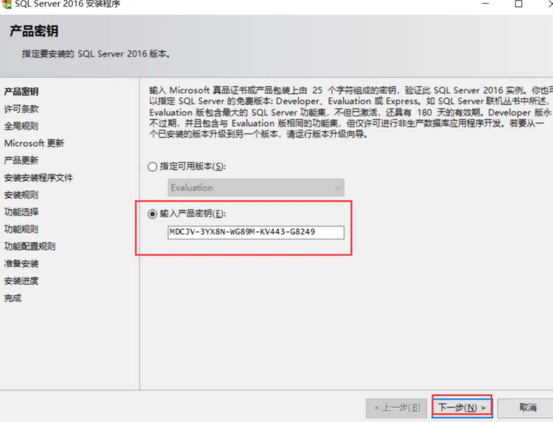 4.选择输入产品密钥,输入秘钥建议用复制粘贴MDCJV-3YX8N-WG89M-KV443-G8249点击“下一步”。(自动填充了就点击下一步)