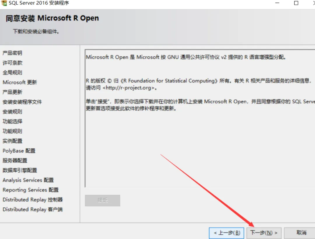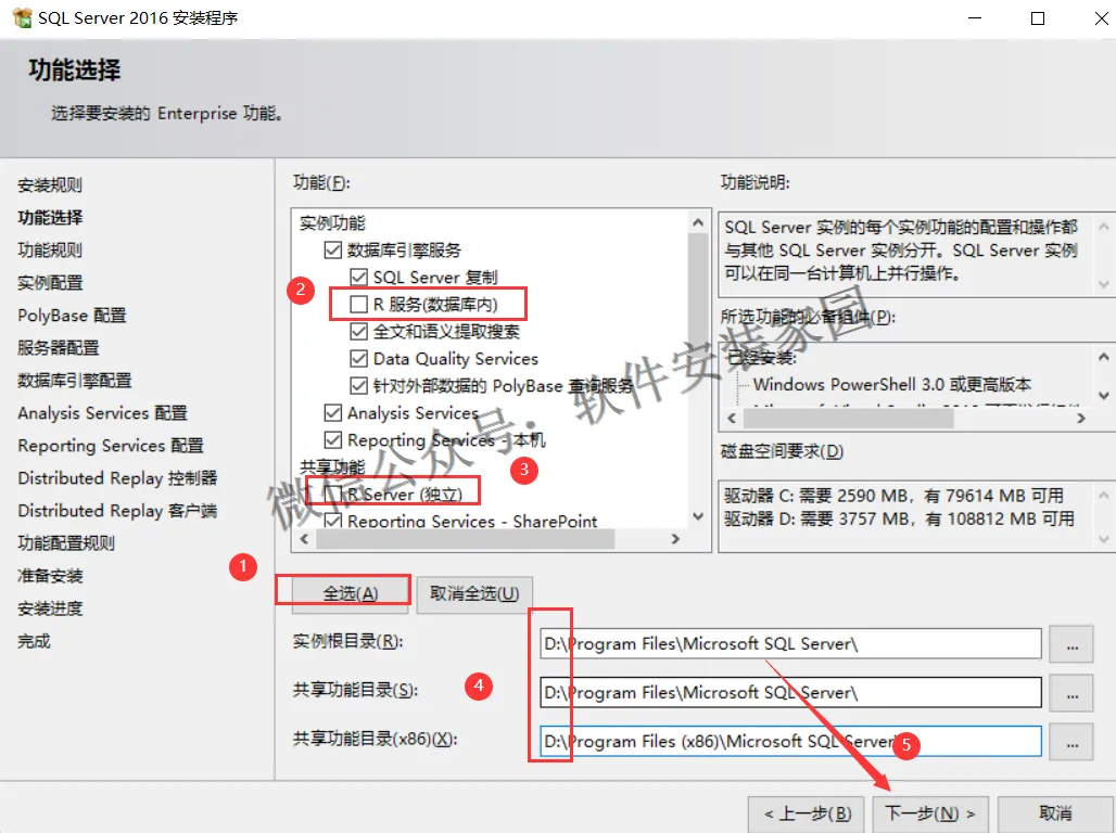 8.点击【全选】,然后取消勾选【R服务(数据库)】和【R Server(独立)】,建议数据库软件安装在c盘以外的磁盘,小编这里安装在D盘,安装地址不能带有中文,可以直接将默认的【C】盘改成【D】,然后点击下一步