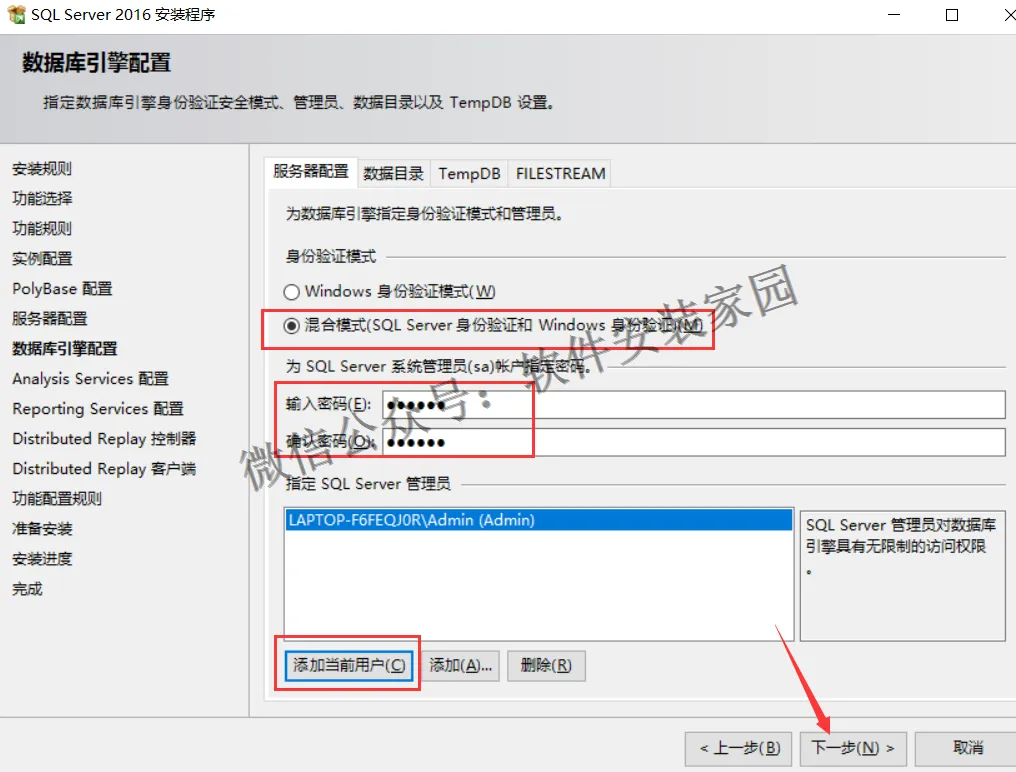 12.选中混合模式 输入密码 一定要记住 点击添加当前用户 点击下一步
