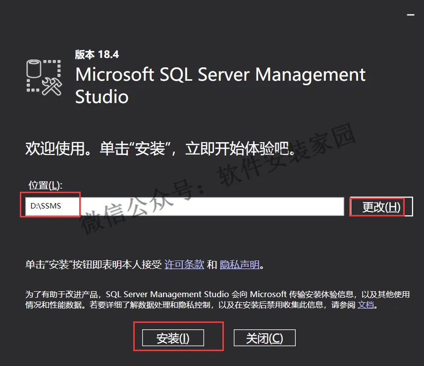23.点击更改,建议安装在C盘以外的其他磁盘,可以在D盘新建一个SSMS的文件夹 选中安装进去,点击安装