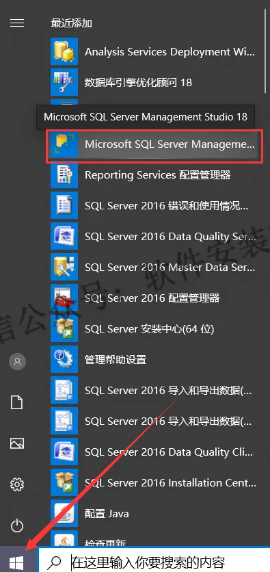 26.电脑重新启动后,点击左下角的【开始菜单】,找到【Microsoft SQL Server Management Studio 18】并用鼠标往桌面拖动即可创建桌面快捷方式。