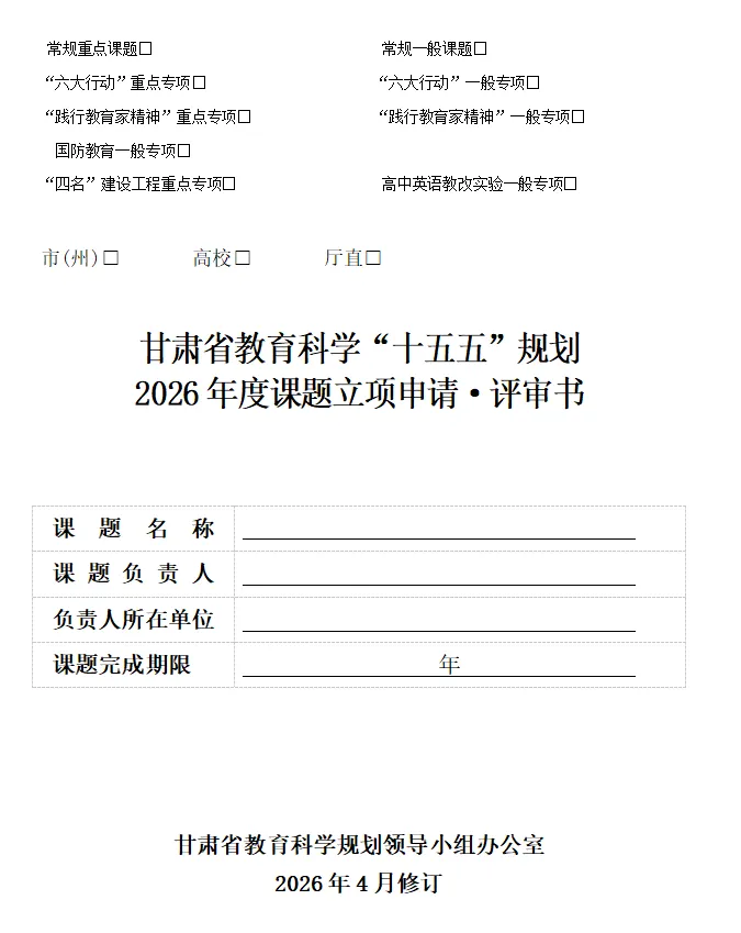 【甘肃规划评审书模版】甘肃省教育科学“十五五”规划2026年度课题评审书注:为了帮助大家解决在教改课题申报的难题,从源头上少走弯路,若需要选题和具体申报文件可以留言或者加好友,进行交流学习,另外还可以申请免费模板。