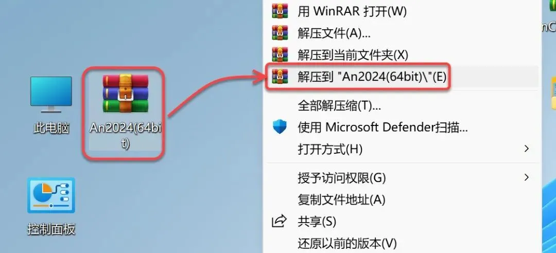 1.鼠标右击【An2024(64bit)】压缩包(win11及以上系统需先点击“显示更多选项”)【解压到 An2024(64bit)】。