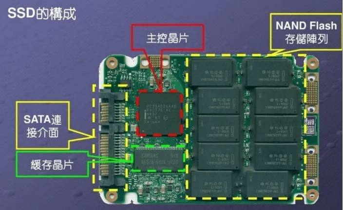 固态硬盘(Solid State Drive,简称 SSD),是一种以NAND 闪存芯片为核心、完全没有机械运动部件的存储设备。它主要由三个部分组成: