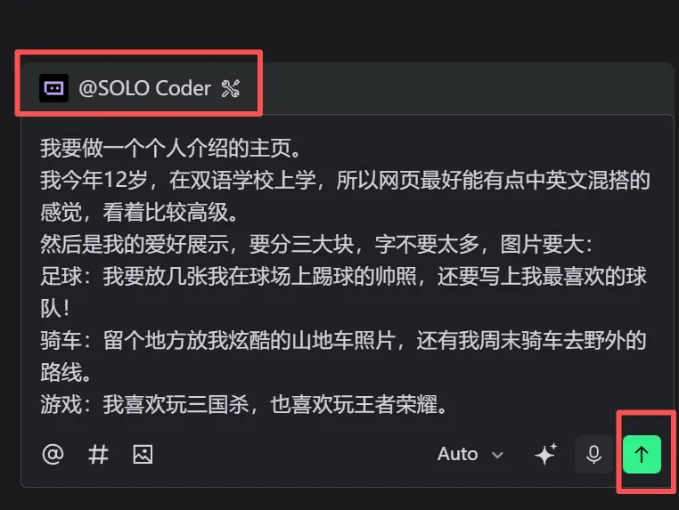 打开 TRAE(提前注册好),使用SOLO模式,新建一个项目。在对话框中,将刚才豆包整理好的那份需求文档直接粘贴进去,并在前面加一句简单的指令:“请根据以下需求文档,为我生成这个个人主页的完整代码,请确保网页美观且可以直接运行预览:[粘贴需求文档内容]”