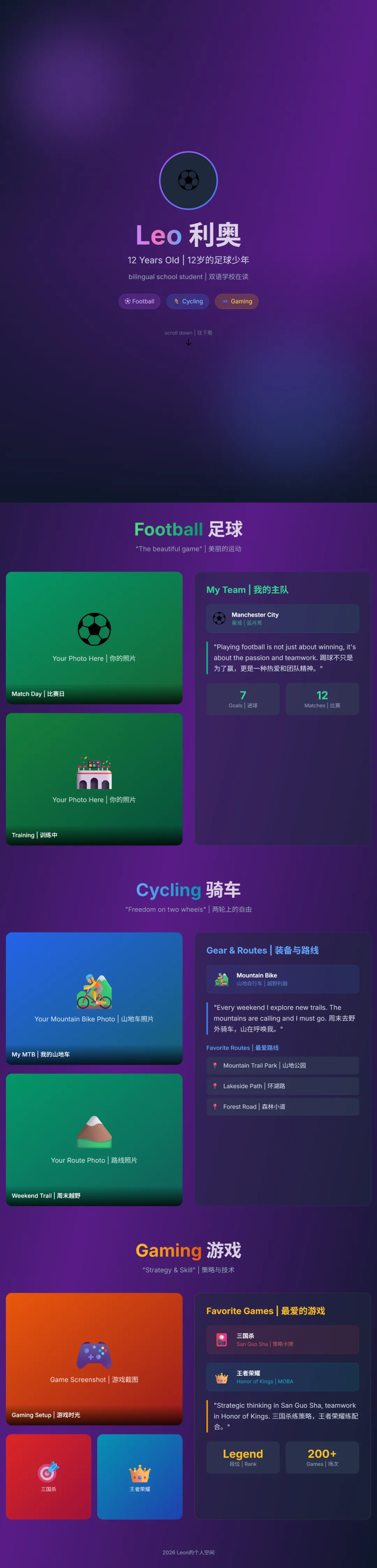 然后是我的爱好展示,要分三大块,字不要太多,图片要大: