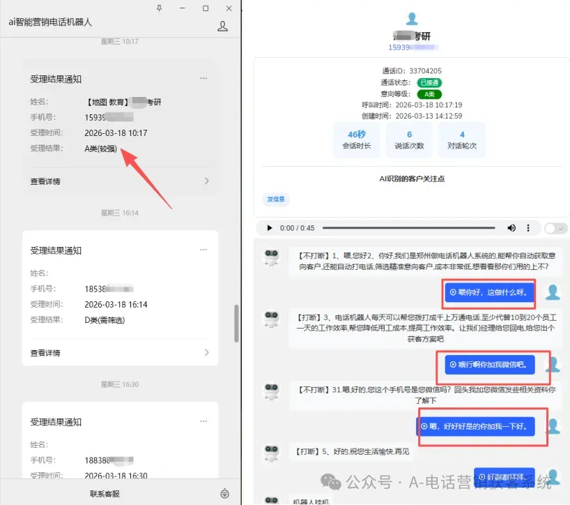 1、ai电话机器人代替人工外呼,每天外呼3000--无限制,机器人通话过程录音,完成后会将该通电话按客户意向程度进行分类,自动推送到你的微信上,工作人员只需对高意向客户人工回访即可,这样就提升了整个电销企业电销人员群体的工作效率。