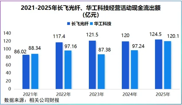 俗话说“欲戴皇冠必承其重”,为保持行业地位,2025年,长飞光纤与华工科技均在主营业务上砸下超120亿元,创下五年之最。