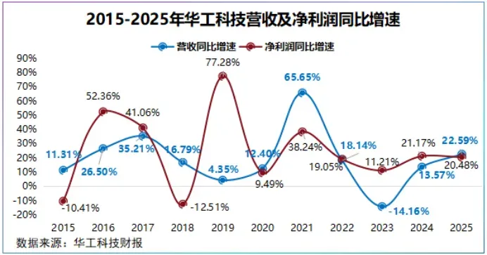 2015-2025年间除个别年份下滑外,华工科技营收及净利润整体保持同比正增长,十年平均增幅分别在19.3%和24.31%,还算稳健。