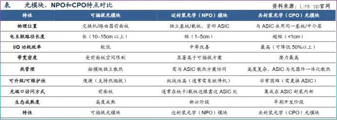 另一个则是封装光学,CPO和NPO,前者强调将芯片和光引擎组装在一个封装壳内,后者强调将光引擎移动到更靠近芯片的地方,NPO可看成CPO的替代方案。