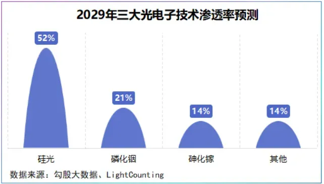 值得注意的是,这三大技术路线是光电子核心技术底层,预计到2029年SiP、InP和GaAs渗透率有望分别达到52%、21%和14%。