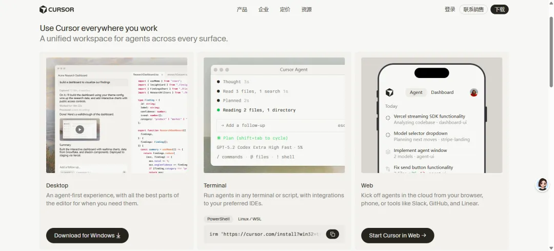 访问Cursor AI的官方网站https://cursor.com/cn/download,在网站上通常会提供下载链接。根据自己的操作系统类型,选择相应的安装包进行下载安装。2. 软件应用商店