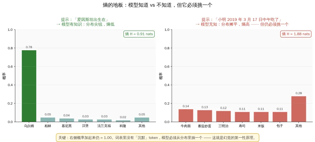 但无论高熵低熵,所有概率加起来仍然 = 1.00。模型必须从这个分布里抽一个 token 出来。它不能停。它没有“我不知道”这个出口。