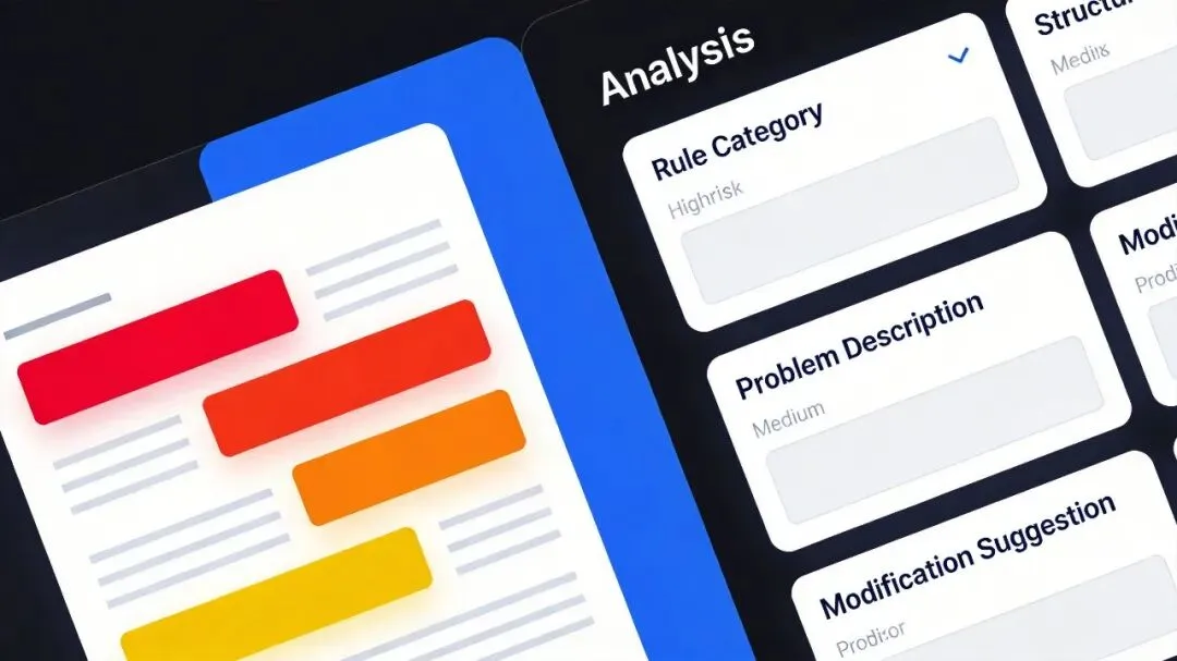 系统会针对每一个文本块,和预先定义好的审核规则逐一匹配,判断是否触发风险。规则通常覆盖几个维度:用词是否符合法律术语规范、关键条款是否完整、合同前后有没有矛盾、违约责任等条款有没有合规问题,以及表述是否足够清晰有没有歧义。