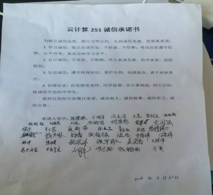 二是开展诚信签约主题教育活动,各班立足自身特点,精心设计涵盖诚信履约、感恩受助、远离失信、诚信求学、学术端正等内容的诚信承诺书,突出针对性与实效性。活动中,全体同学庄重签署诚信承诺书,以书面承诺坚定恪守诚信底线、自觉践行诚信规范的态度与决心。通过自主设计、自愿签署、自觉践行的方式,推动学生从被动接受教育转为主动认同践行,切实将诚信理念内化于心、外化于行,不断强化诚信意识与责任担当,营造人人讲诚信、处处守诚信、时时践诚信的良好班风学风,确保诚信教育走深走实、取得实效。