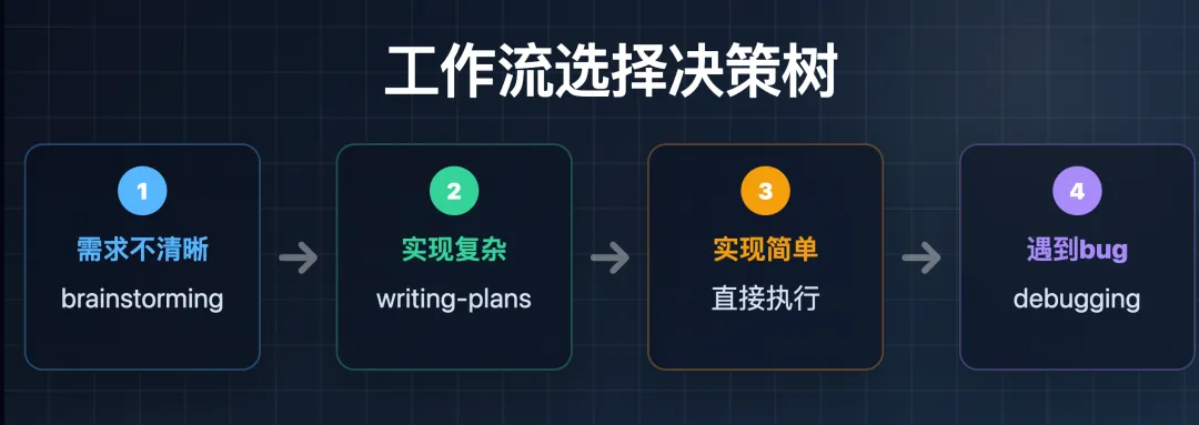 场景 1:需求不清晰 ↓ → 用 brainstorming,先把需求问清楚再动手场景 2:需求清晰,实现复杂(2+ 个独立模块) ↓ → 用 writing-plans + subagent-driven,先规划再执行场景 3:需求清晰,实现简单(1 个文件改几行) ↓ → 直接执行,不用绕弯子场景 4:遇到 bug 了 ↓ → 用 systematic-debugging,先诊断再修复记住一个原则:用最简单的工作流把事做对。