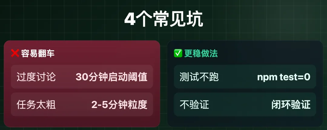 验收公式:npm test 退出码 = 0如果没有测试退出码 = 0,任务不算完成这一条写进肌肉记忆里。AI 说"测试写了"不算数,必须"测试跑过了"才算数。