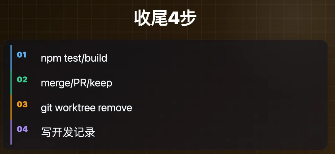 # 删除 worktree(如果用了的话)git worktree remove ../todo-app# 检查是否有未提交的更改git status收尾不清理,次年回来做新功能的时候,全是遗留问题。