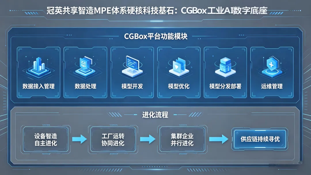 冠英共享智造MPE体系的硬核科技基石,是CGBox工业AI数字底座。它提供数据接入管理、数据处理、模型开发、模型优化、模型分发部署、运维管理的一站式平台,在持续运营的过程中,不断获取产业高质量数据集,自主训推迭代出行业经营“Know-How”模型算法库,实现从设备智造自主进化,到工厂运转协同进化,再到集群企业并行进化的供应链持续寻优局面,从而将碎片化中小企业集群,整合为有机组织、高度智能的产业生态体系。
