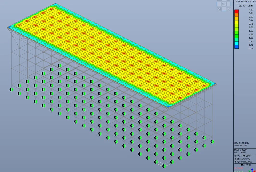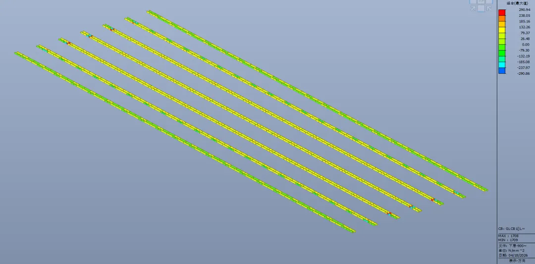 板模板靠墙悬挑过大怎么办?普通墙模板要设置面板+方木+双钢管及3形卡,最少需要占用将近300mm的空间,会造成板模板悬挑过长的情况。一计算,板的双钢管主肋应力290多兆帕,已经超过了205兆帕的允许应力。这时候在悬挑部分加个斜杆扣件式钢管+顶托+斜木方顶一下即可,最大主肋应力就减小到205兆帕以内,为196兆帕,已经合格了。计算过程中已经加了1.3/1.5的分项系数,个人认为临时结构按实际尺寸计算,只要能计算材料能满足规范要求就可以了,没必要再打折了。相应的38*88mm木方和木模板应力也都合格了,是最经济的调整方法。这里模拟的是600mm厚钢筋混凝土,15mm模板,方木次肋间距300mm,48盘扣支撑架间距900*900mm。添加的斜杆提取下计算的轴力,小于8kN,单个扣件就可满足。8kN是扣件满足《JGJ 130-2011 建筑施工扣件式钢管脚手架》表5.1.7扣件抗滑承载力设计值的要求。