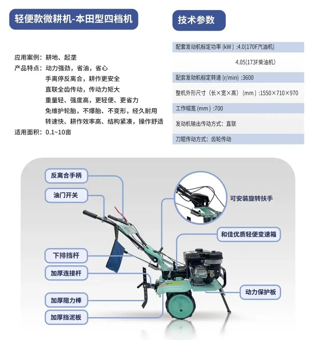 :旋耕深度阻力传感器反馈。当土壤硬、阻力大时,自动降低转速、增大扭矩,保护刀片和电机。 - 三级调速(智能)