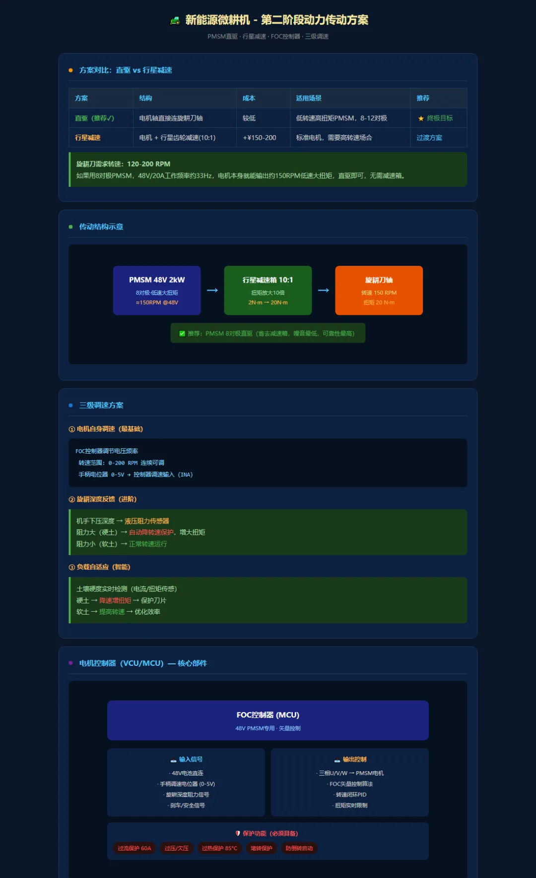 第二阶段中,永磁电机直驱旋耕刀中间是直接连接还是需要变速箱?如何控制转速?是否需要电机控制器?
