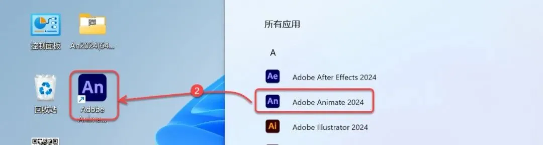 8.创建桌面快捷方式:①点击桌面任务栏中的【开始图标】>点击【所有应用】②将【An图标】拖到电脑桌面。