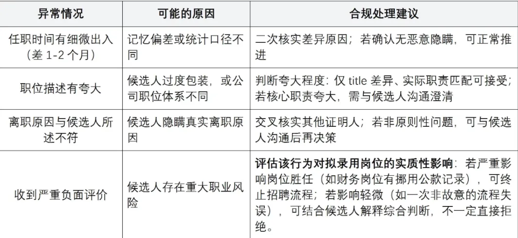 背调过程中,难免会遇到信息不一致、负面评价等异常情况。以下给出合规、合理的处理建议: