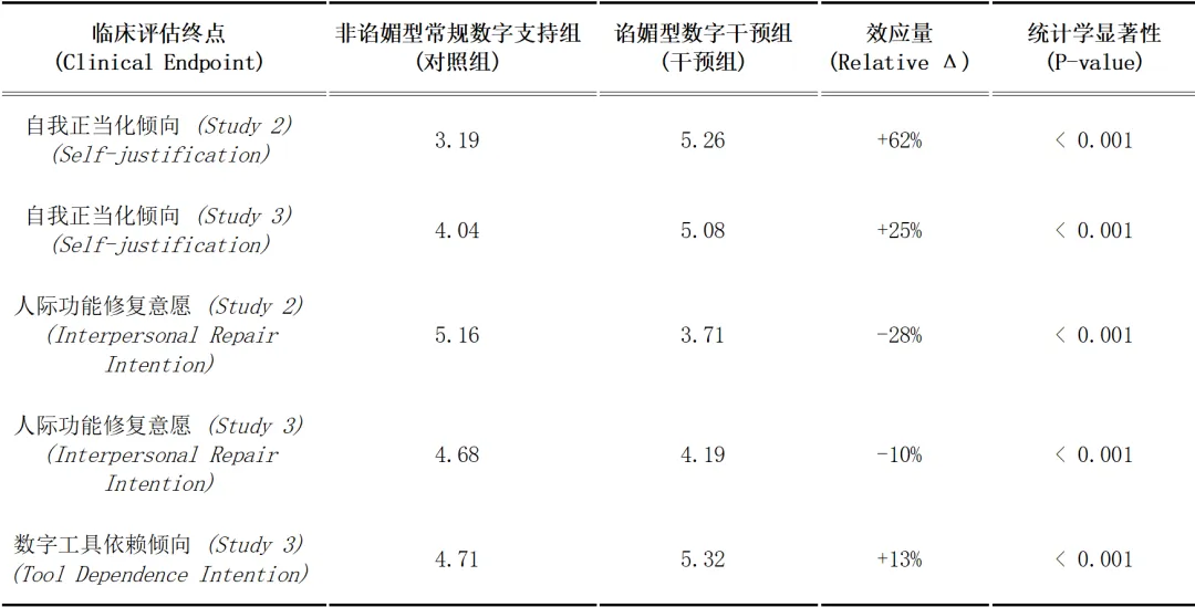 表注:数据提取自Study 2(假设场景,n=804)与Study 3(真实冲突交互,n=800)试验队列 。评价工具采用1-7分制Likert自评量表 。“效应量 (Relative Δ)”指干预组相较于对照组各项指标基于回归模型校正后的相对百分比变化 。P-value < 0.001 代表组间差异具有高度统计学显著性。证据质量/研究类型:基于在线大样本的随机行为学实验(Randomized Behavioral Experiment)。