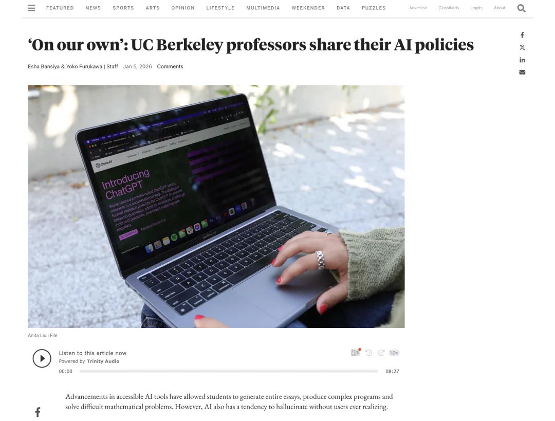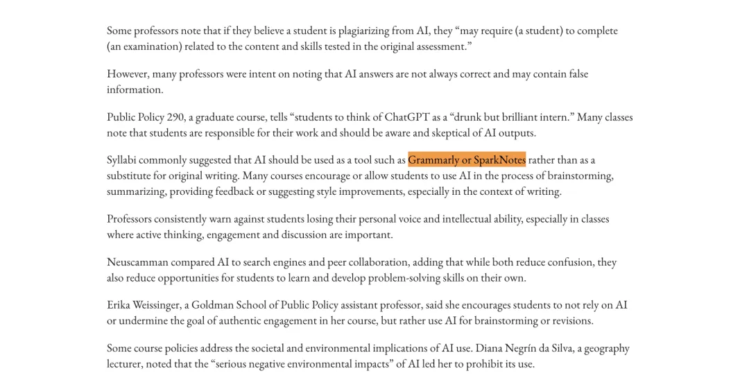 多数伯克利教授在课程大纲中建议学生把AI当成Grammarly或SparkNotes这类辅助工具,只用于头脑风暴、总结信息和修改语法,而不要用它来代替思考。