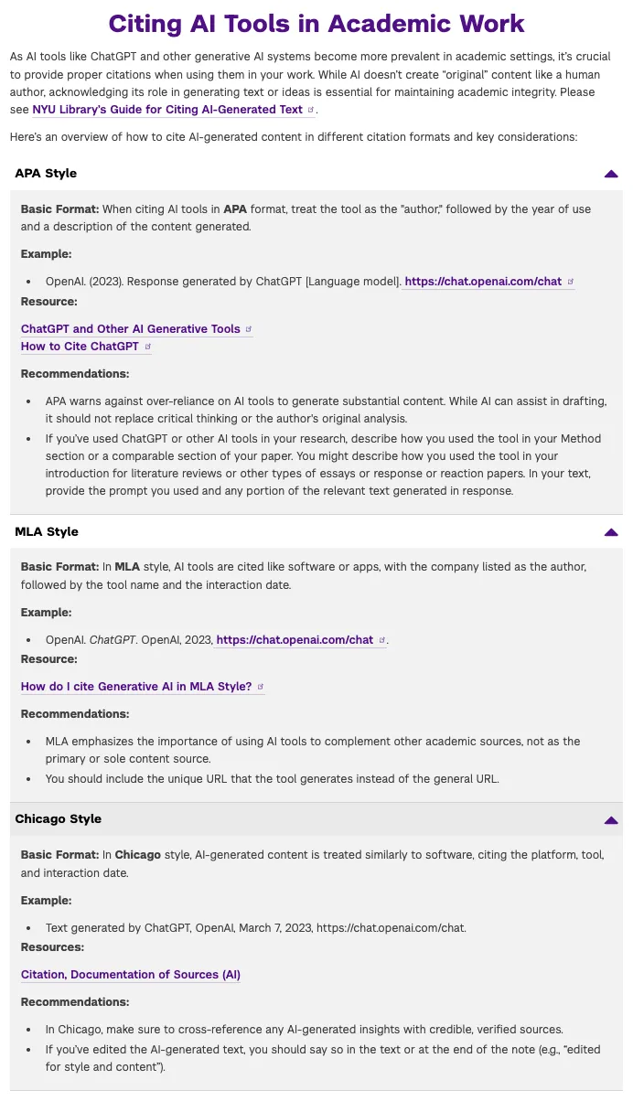 纽约大学建议老师在课程大纲中写清楚AI的使用规定。但凡老师允许用AI,且你在作业中使用了AI,必须注明来源。官网列出了引用AI工具的三种学术格式,供学生参考:
